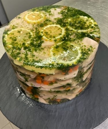 Notre poulet en gelée allie la douceur de la viande de poulet à la fraîcheur de la gelée, une bouchée exquise à déguster en toute légèreté.