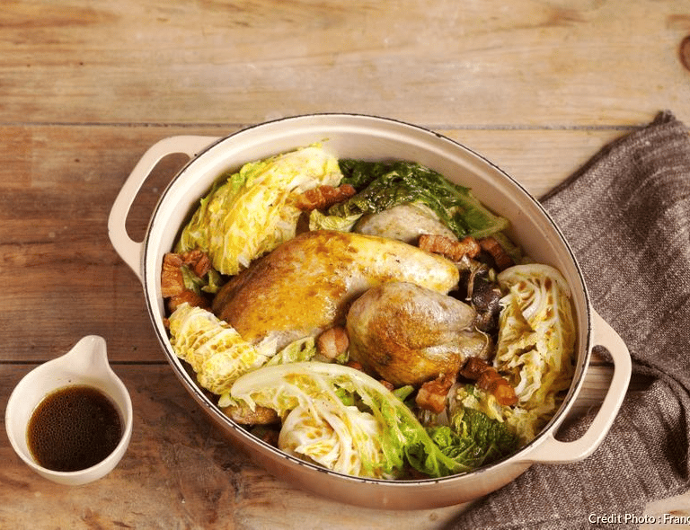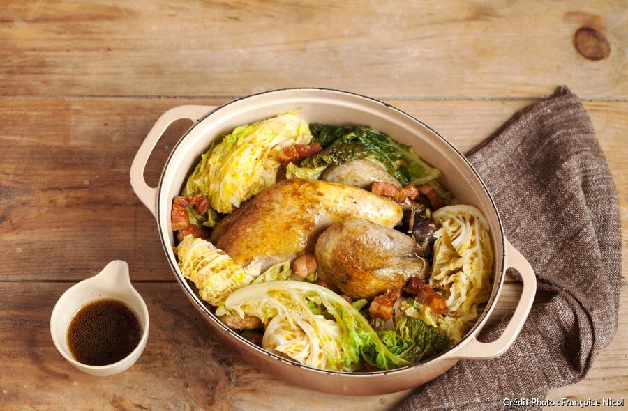 À leur place, faites revenir le chou émincé, puis remettez la viande. Versez le bouillon de volaille, le thym et le laurier, couvrez et laissez cuire 1h environ, en retirant les ailes 20 min avant la fin de la cuisson. Retirez au dernier moment le thym et le laurier et servez chaud, directement dans la cocotte.